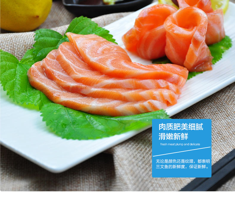 三文鱼是世界名贵鱼类之一。鳞小刺少,肉色橙红,肉质细嫩鲜美,口感爽滑,既可直接生食,又能烹制菜肴,是深受人们喜爱的鱼类。