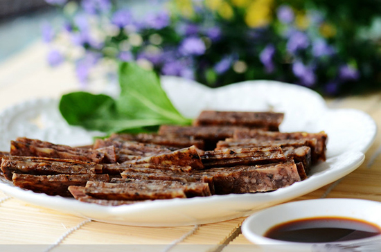 酒和八角、川椒、丁香、桂皮、大茴、小茴等十多种香料作调味品。然后用豆腐膜包裹起来,置于一个特制的木规之中,外加以比例适当的重物压榨,挤出其中的猪油和水分,方可开规。