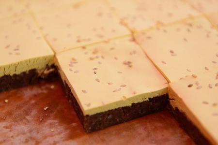 3.制糕粉、成型:将窨糕粉、翻砂糖混合擀压成绵润的糕粉。取一半糕粉用60目筛筛入印模,装上馅块,再筛上另一半糕粉,铺平,压光,翻倒在糕板上,让其自然凝固后装盒即可。
