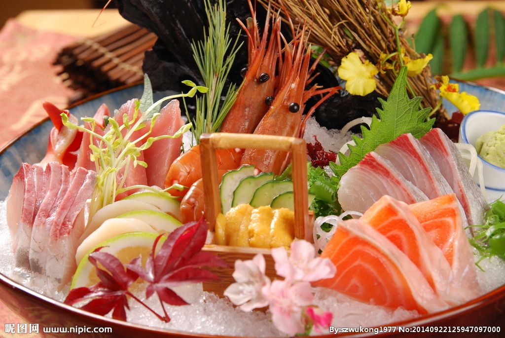 刺身拼盘是一道美食,大多由生鱼片等搭配制成,配芥末酱油沾食,口味清新独特,是具有传统的日本料理特色的食品。刺身以漂亮的造型、新鲜的原料、柔嫩鲜美的口感以及带有刺激性的调味料,强烈地吸引着人们的注意力。