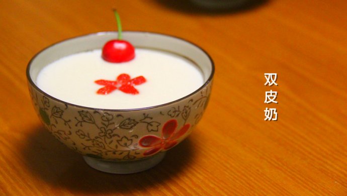 蒸好的牛奶晾凉后会有一层奶皮,将奶皮轻轻划破,牛奶倒出,碗底保留一点