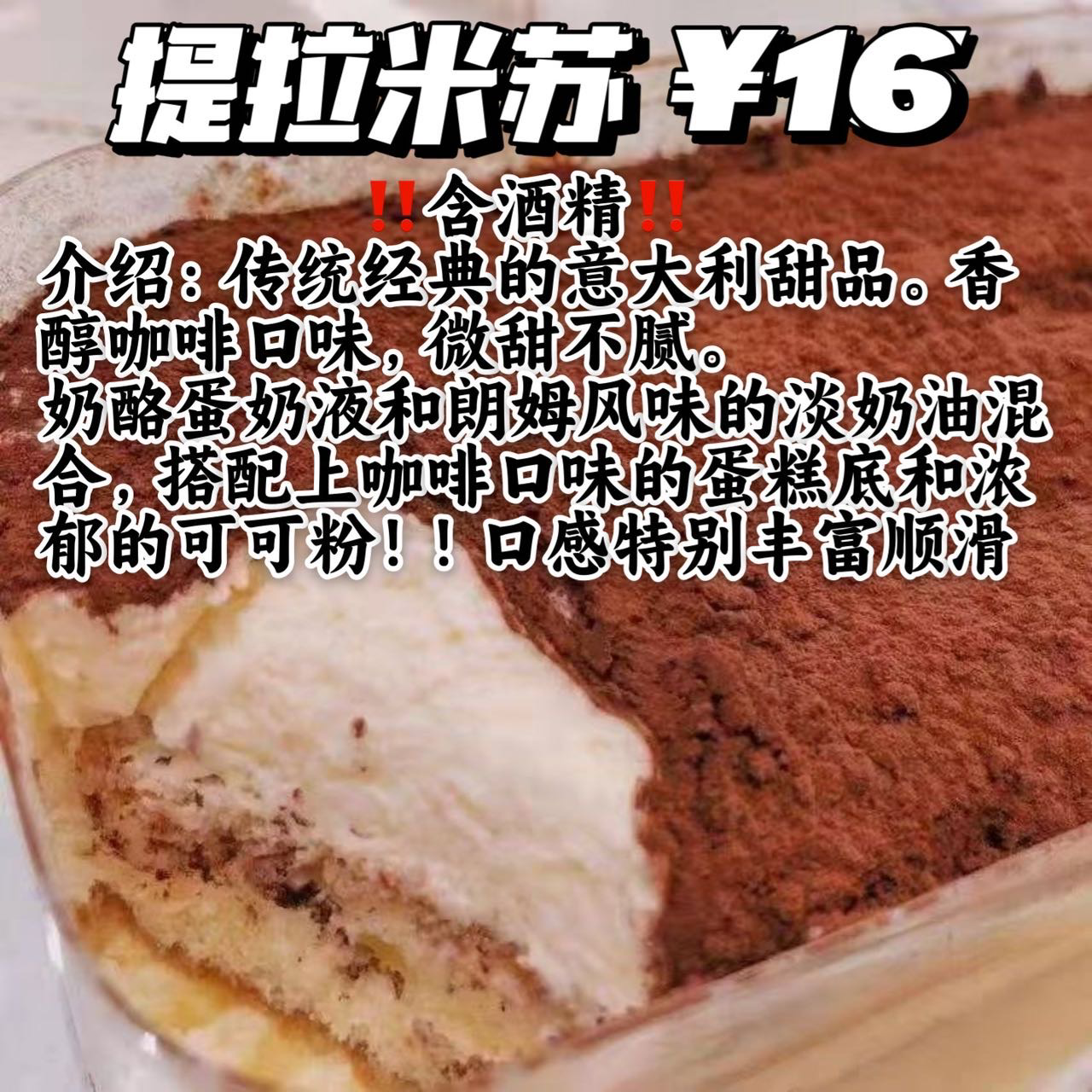 传统经典的意大利甜品,香椿咖啡口感,微甜不腻。