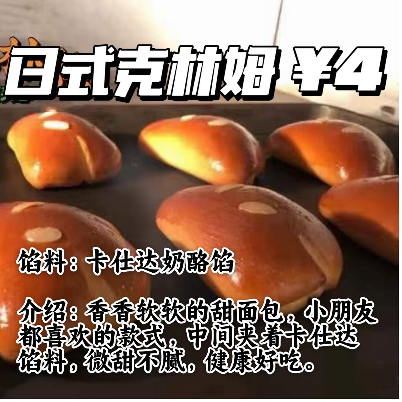 香香软软的甜面包,小朋友都喜欢的款式,中间夹着卡仕达馅料,微甜不腻,健康好吃