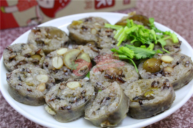 猪肠胀糯米是广东潮汕地区普宁古城洪阳的一种地方民间传统小食。其一般制法是取猪大肠中段,用食盐、纯碱或淀粉反复搓洗至无异味,将糯米先浸软,与猪肉、香菇、虾、莲子等辅料拌匀,调入食盐、味精、胡椒粉等调味品,然后填装入洗好的猪肠中(“胀”在潮汕方言中有把东西装入容器中的意思,“猪肠胀糯米”名称由此而来),两端用纱线扎紧,放开水锅里煮约1小时,捞出斜切成小片,蘸甜酱油食用(酱油调进红糖、适量辣椒、淀粉,小煮开,撒进炒香的白芝麻)。商品详情