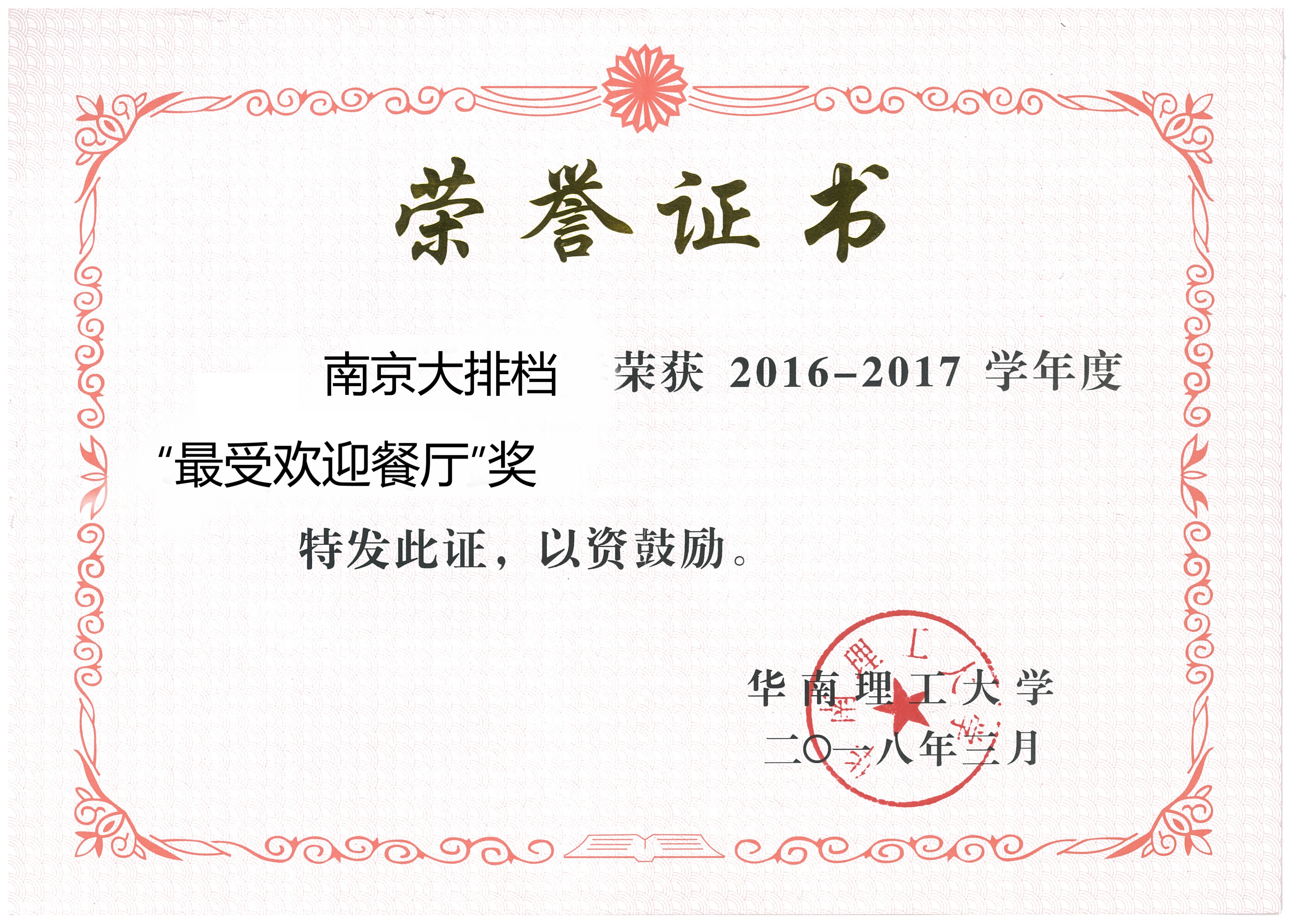 荣获2016-1017年度“最受欢迎餐厅”奖