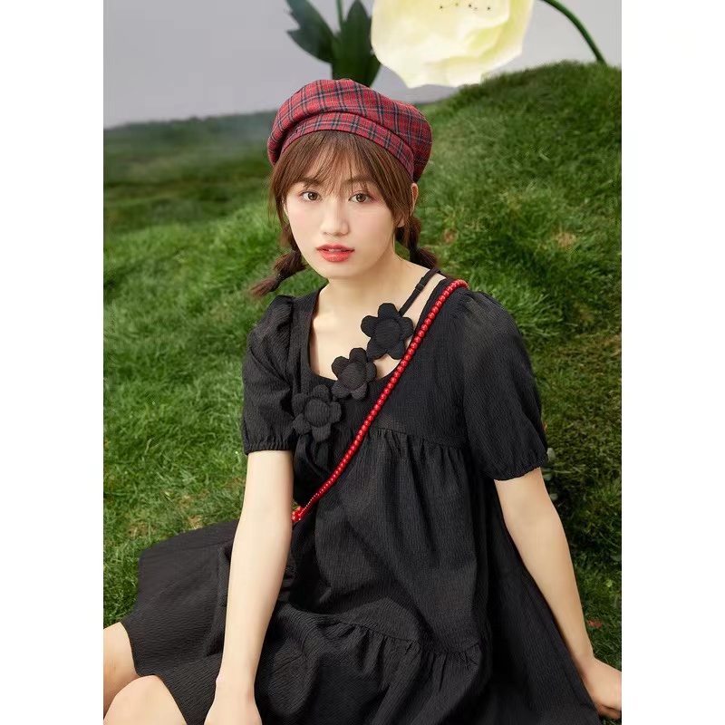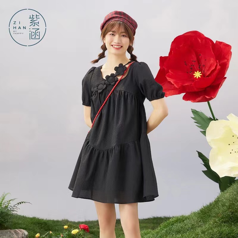 紫涵设计感花朵连衣裙2022夏新款U型领甜酷泡泡袖A字裙中长款个性商品详情