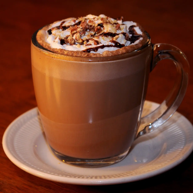把一杯意大利浓缩咖啡和一大杯热热的牛奶同时倒入一个大杯子,最后在液体表面放两勺打成泡沫的奶油。
