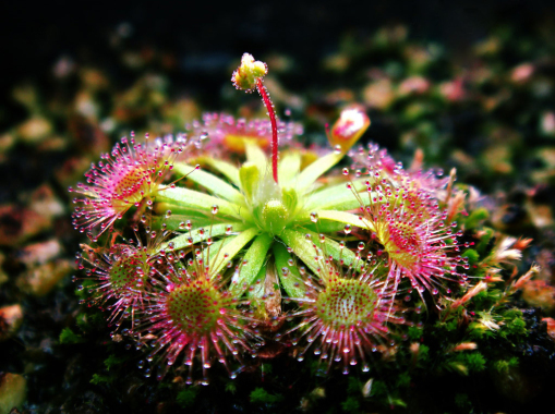 茅膏菜是食虫植物中的一个大类,它们形态各异,分布于世界各地。它的叶片密布着晶莹剔透的“露珠”,光彩夺目,深受人们喜爱。然而,对它的猎物而言,这些耀眼的光芒却是“致命”的,因为茅膏菜正是通过这些“露珠”来进行捕猎的。