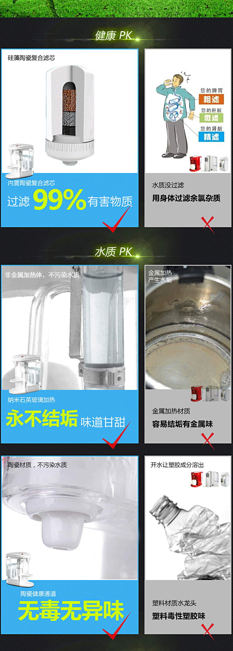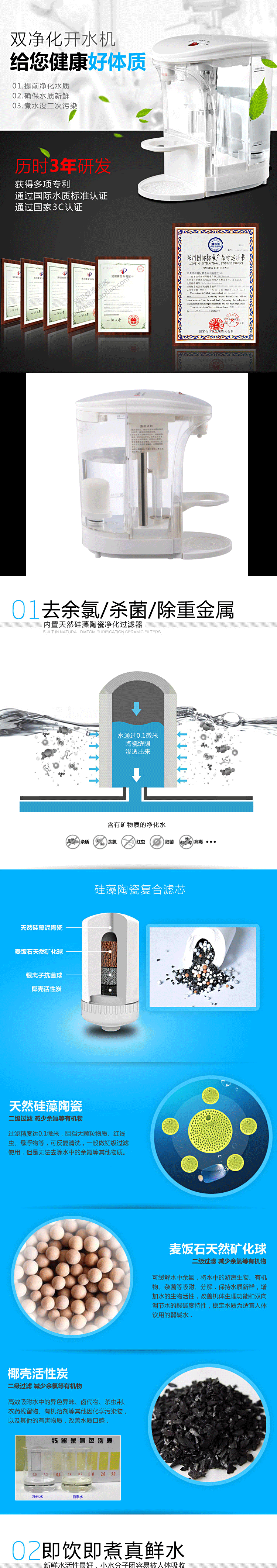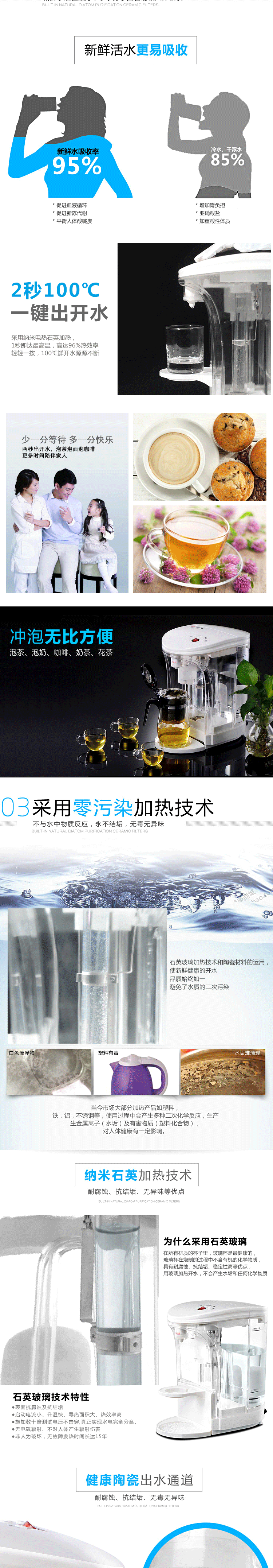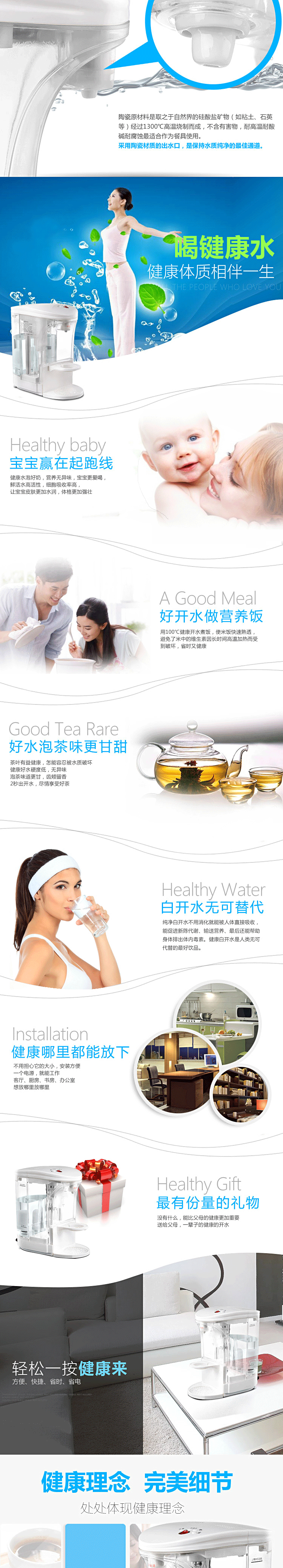 产品五大优点 快:即按即开,水流穿过滤芯后再通过石英玻璃电热管即沸腾导出 新:有别于传统煮水方式,无需水壶,为最新最清洁动态煮水方式 清:进水前端装陶瓷滤芯,滤掉泥沙、铁锈等有害物质,水质呈弱碱性 鲜:石英玻璃管煮水,不含金属氧化物,无反复加热千沸水,清澈新鲜 省:即用即开,喝多少煮多少,无需保温耗电,省心省时省电节能环保