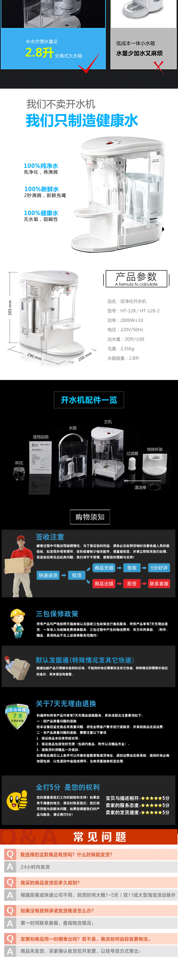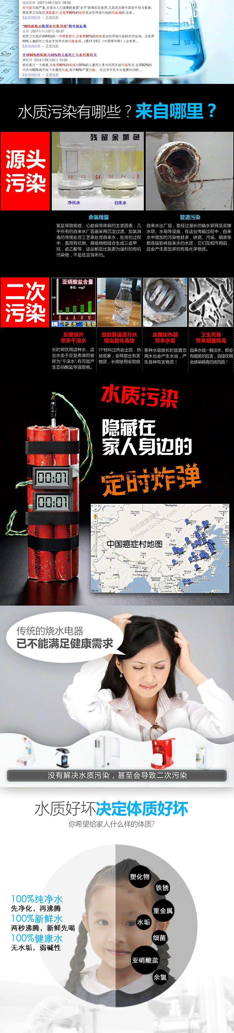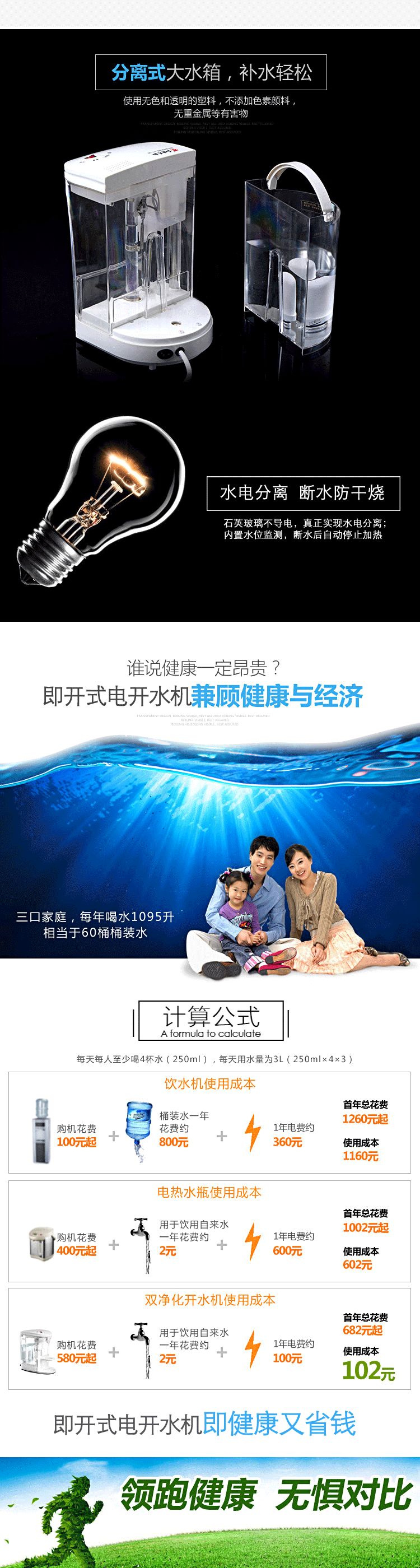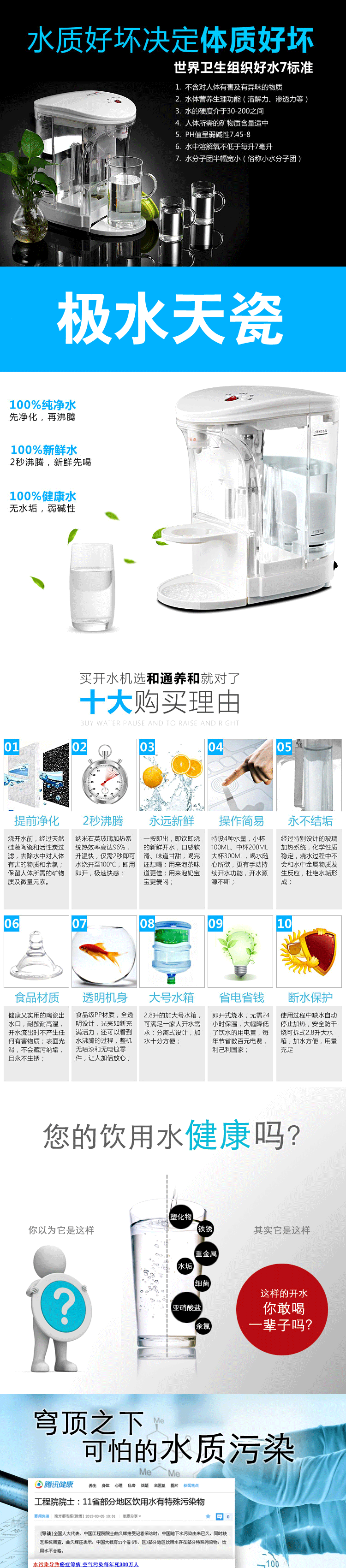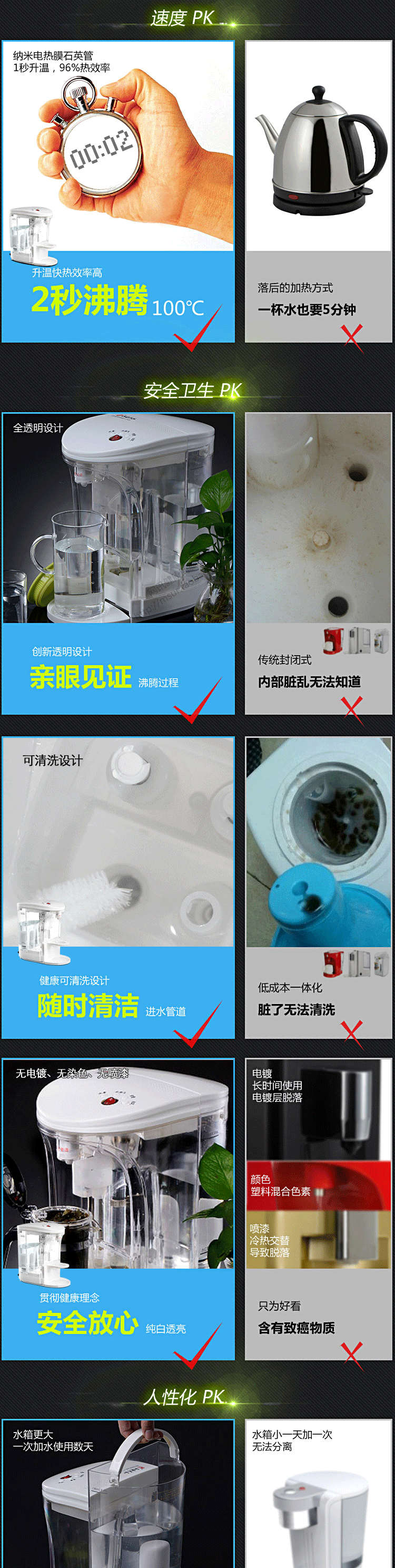 产品五大优点 快:即按即开,水流穿过滤芯后再通过石英玻璃电热管即沸腾导出 新:有别于传统煮水方式,无需水壶,为最新最清洁动态煮水方式 清:进水前端装陶瓷滤芯,滤掉泥沙、铁锈等有害物质,水质呈弱碱性 鲜:石英玻璃管煮水,不含金属氧化物,无反复加热千沸水,清澈新鲜 省:即用即开,喝多少煮多少,无需保温耗电,省心省时省电节能环保