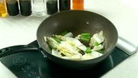 锅入油,放入蒜子爆香,下入荷兰豆, 翻炒数秒,倒入白菜,炒软。