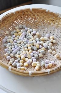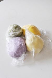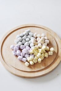 拌入250g木薯粉,揉面团,分两份一份加抹茶粉揉均匀。南瓜+蒸南瓜的水+1汤匙糖料理机打泥,加125g木薯粉揉团。紫薯+20g水+1汤匙糖打泥,加125g木薯粉揉团。