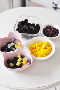 黑凉粉芒果切丁,椰汁酸奶炼乳混合。