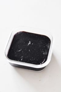 黑凉粉煮好。(黑凉粉煮法:乐扣长方形饭盒4盒子水+1袋黑凉粉=3乐扣盒凉粉。先用1盒水,把凉粉彻底冲开,搅拌均匀。剩下三盒水煮沸,一边冲入凉粉糊,一边搅拌,彻底搅拌均匀后,上锅煮开,边煮边搅,直到顺滑无颗粒,立刻倒入容器,片刻不能等。)