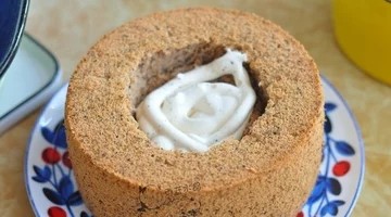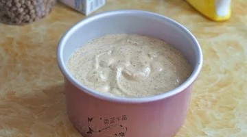 .倒入6寸戚风模具中,震出气泡,放入烤箱,160度烘烤45分钟。出炉后倒扣晾凉备用。