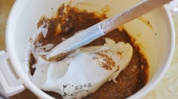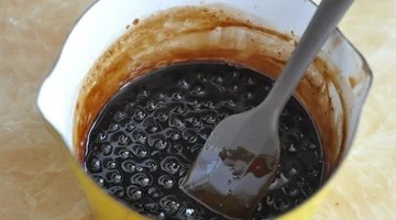 .在烤蛋糕期间,将珍珠煮30分钟,焖20分钟,捞出冲洗干净。然后将黑糖块加100克水,加热至黑糖水变浓稠,放入珍珠煮到汤汁变稠变粘,关火放凉备用。