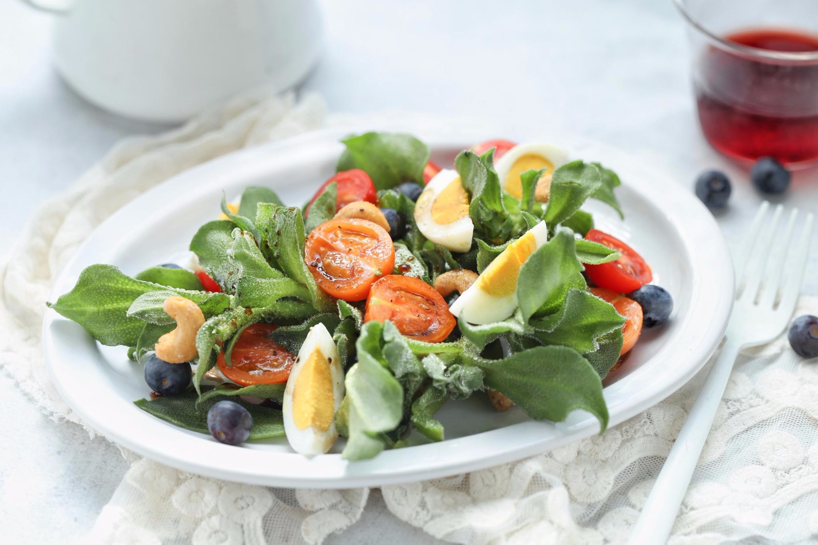 『煮熟的鸡蛋,牛油果,蔬菜,烤熟的杏仁片』
