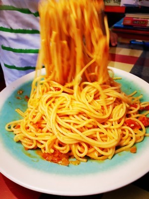 把准备好的面放入开水中。锅里放一勺盐,开水煮面时间10-15分钟。捞起,放入盘子里,滴入橄榄油搅拌,这样油更香!