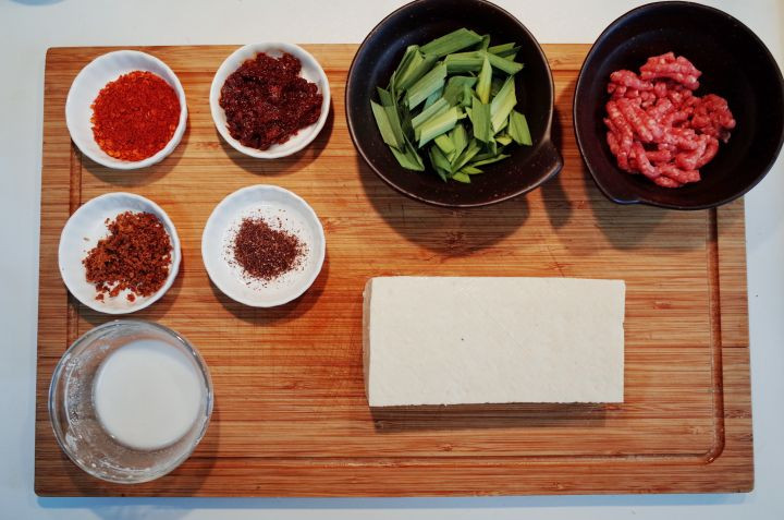 『卤水豆腐,青蒜苗,牛肉末,花椒粉,水淀粉,料酒,食用油』