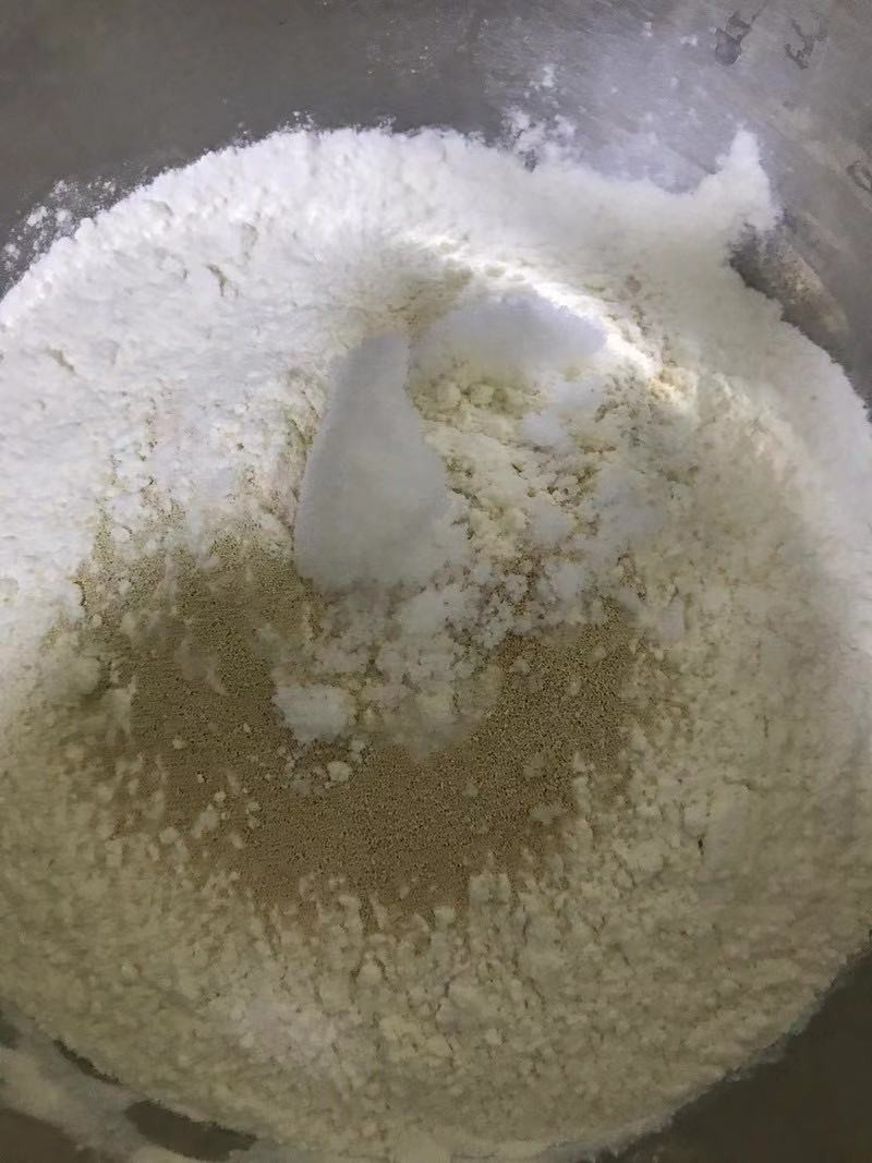 面粉、酵母和糖放盆里搅拌均匀