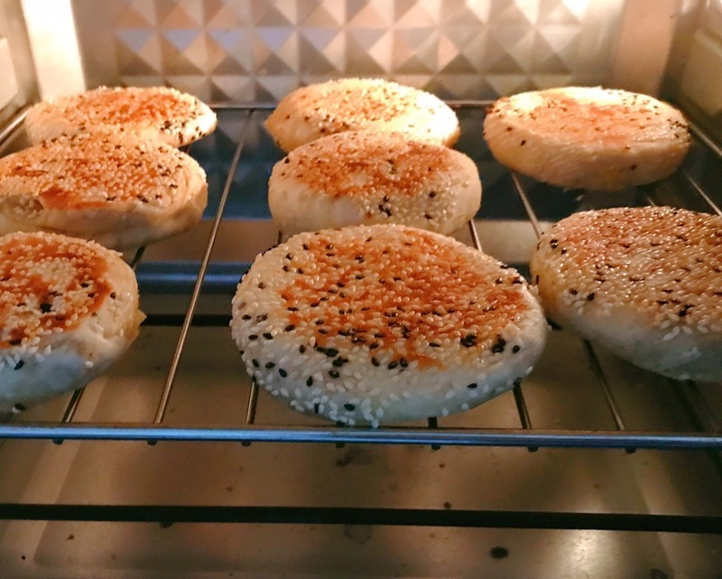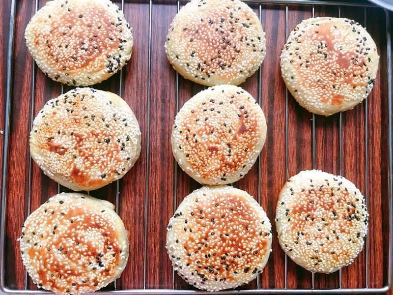 表面沾一层水,沾一层芝麻,擀成饼