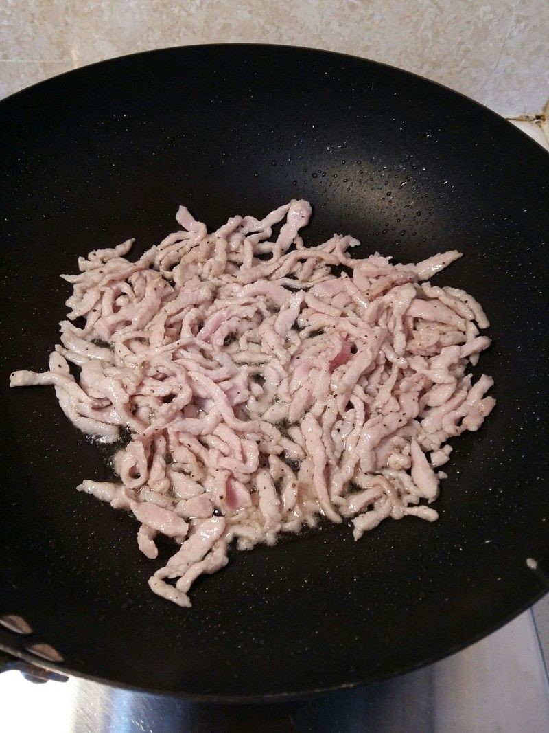 瘦肉洗净切丝,并用盐,胡椒粉,料酒,蛋清和淀粉上浆腌制10分钟