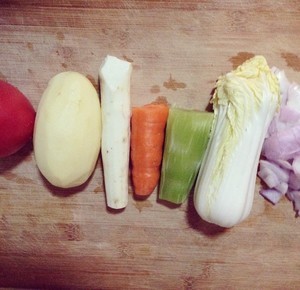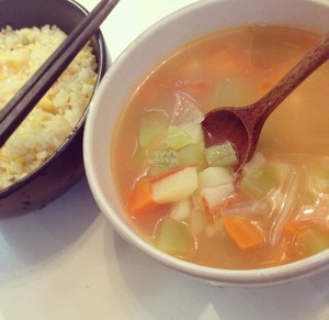 水开之后,放入各种丁,先放土豆、胡萝卜比较耐煮的,再依次放入其它。一起煮约20分钟。加盐、鸡精,出锅。汤面上滴几滴香油或橄榄油。