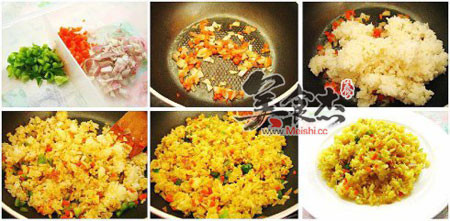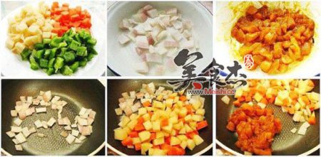备料: 1. 鸡丁肉洗净用少许料酒和咖喱粉腌上备用 2. 洋葱,青椒切片,胡萝卜土豆切丁备用,边角料可以切成碎末用于炒饭