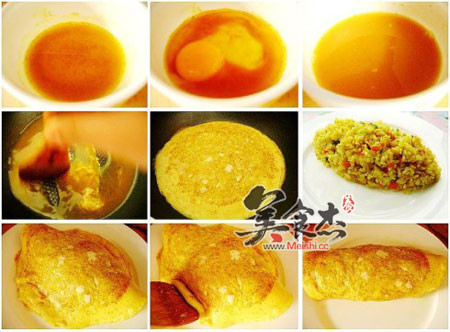蛋包饭的做法: 1. 锅中少许油,下洋葱,或萝卜末煸炒,倒入米饭,拌炒1分钟,倒入一小匙青椒末和咖喱粉,以及少量的盐,炒到米饭颗粒分明,变成均匀的黄色即可盛出 咖喱蛋包饭UE.jpg 2. 用一点料酒和一汤匙水调一下咖喱粉和很少量的淀粉,之后倒入一个鸡蛋,充分搅拌打匀 3. 锅底抹油,烧热,小火,倒入蛋液,头6秒快速搅拌一下蛋液,之后静置小火将蛋皮摊熟,中途可盖盖,蛋的表面会有点水分,不要等蛋熟过了,差不多晃动锅子蛋皮能滑动就可关火了 4. 可把炒好的咖喱饭放在蛋皮上