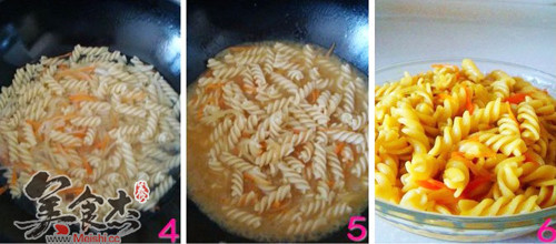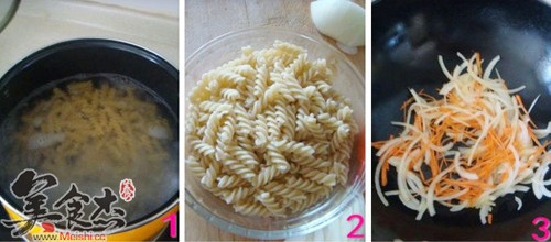1. 意面放锅里煮到八分熟 2. 捞出过冷水后备用,元葱、胡萝卜切丝 3. 炒锅放少许油烧热后,放入元葱丝和胡萝卜丝翻炒