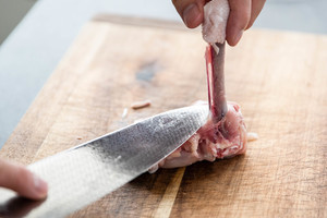 鸡腿肉剔除骨头,鸡腿肉切块;加入黑胡椒、盐、腌制20分钟