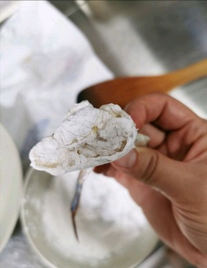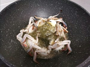 起锅倒油,多倒一些,把裹好淀粉的螃蟹下锅稍微煸炒一下。螃蟹都变红以后就可以捞出来控油备用了,这锅油不要了