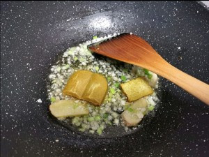重新起锅倒油,下葱姜爆香;放入咖喱块,小火熬化