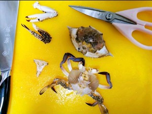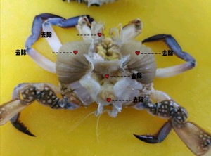 螃蟹洗洗准备好。把螃蟹两个大钳子取下,顺便用刀背把钳子拍裂(避免后续处理中被钳子夹到),螃蟹的尾部剪去,开螃蟹壳后把腮等部位去除(看下图