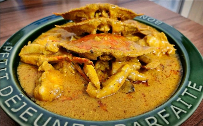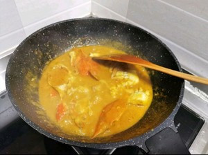 倒入椰浆后,加入适量水,够煮螃蟹就可以,转大火烧开,放入备用的螃蟹煮5 6分钟即可