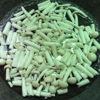 就白玉菇洗净切成3厘米的小段。锅里烧水水开后加入白玉菇焯一分钟去草酸。