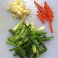 蒜瓣切末,小米辣去籽切丝,葱切段。