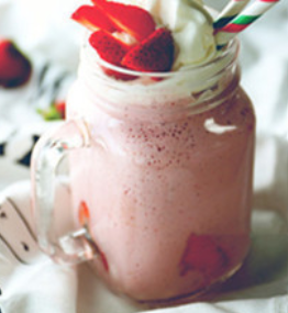 接着倒入杯中挤上一杯奶油在点缀一点草莓在上面,插上习惯就完成。