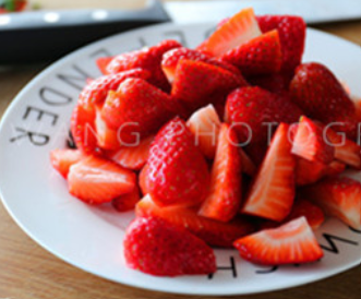 之后将剩下的草莓,全部去掉根蒂,切成4瓣。