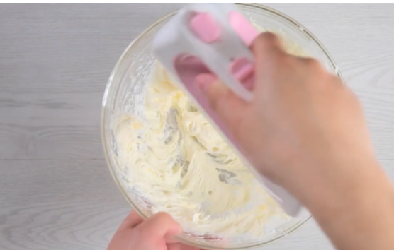 准备糖粉,吉利丁片,消化饼干,黄油,牛奶,淡奶油,奶油奶酪,将奶油奶酪,糖粉倒入碗中搅匀。
