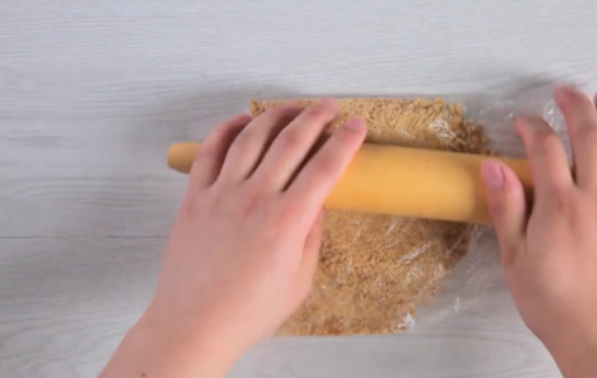 倒入打发好的奶油奶酪,分三次倒入,搅拌至顺滑,将消化饼干压碎,加入黄油,冷藏15分钟。
