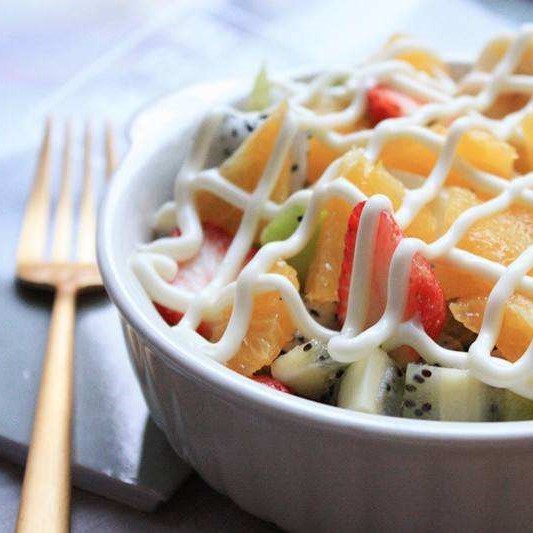 将当季的水果和蔬菜洗净,切至合适大小,放入一个碗中,加入适量沙拉酱,搅拌均匀即可。