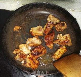 放入排骨,翻炒上色。