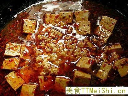 加半碗汤(水也可),烧沸后放豆腐、肉末烧三、四分钟。
