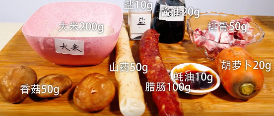 准备大米,山药,腊肠,排骨,胡萝卜,香菇等食材