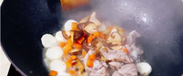 将胡萝卜切丁,排骨焯水,香菇切花刀,腊肠切片,大米洗净。并翻炒胡萝卜、香菇等备用。