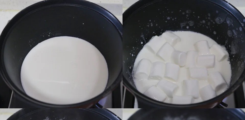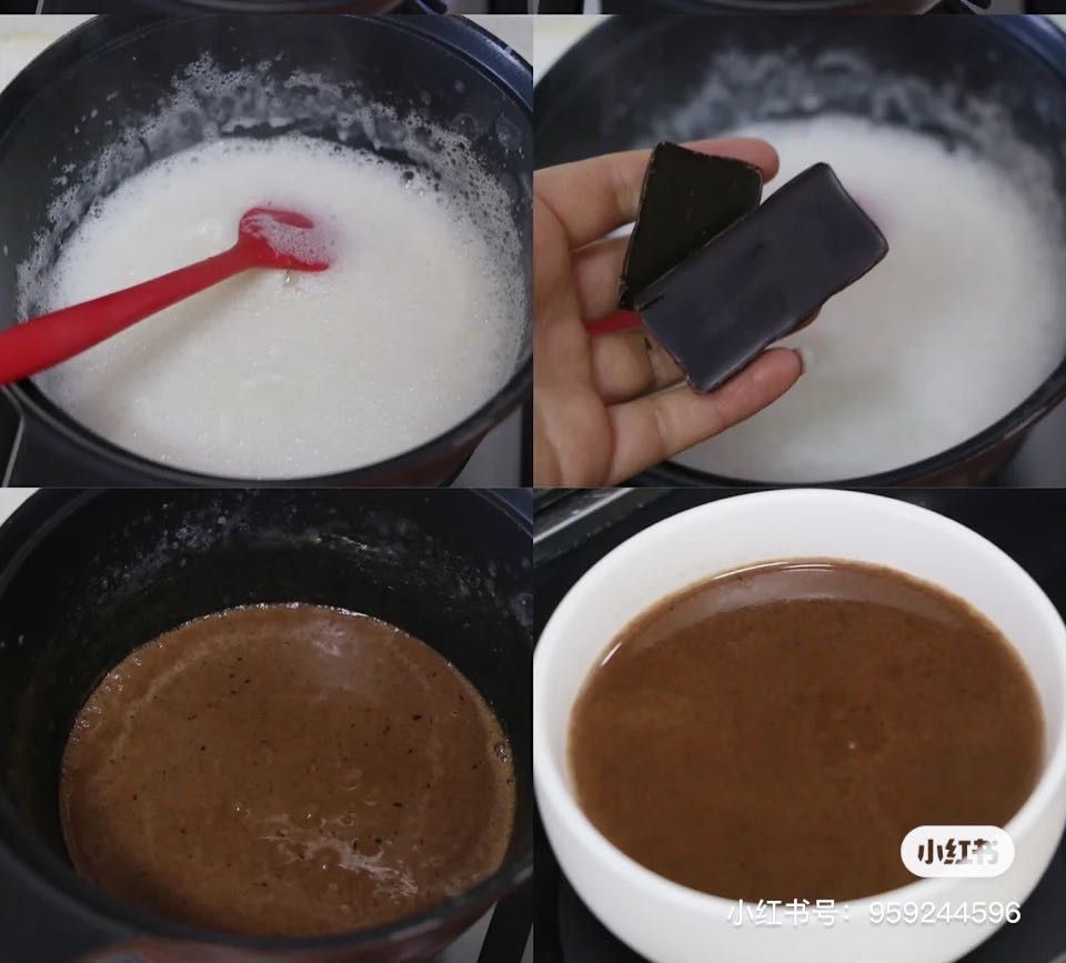 加入黑巧克力继续搅拌至融化,过筛倒入碗中,冰箱冷藏5小时定型。