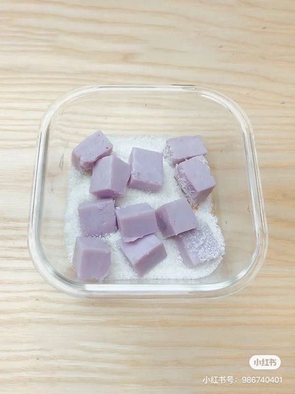 倒入膜具摊平,放入冰箱冷藏;脱模切成小方块,裹上椰蓉。