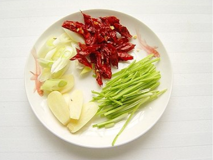 葱蒜切片,干辣椒斜切成段,香菜梗切段。
