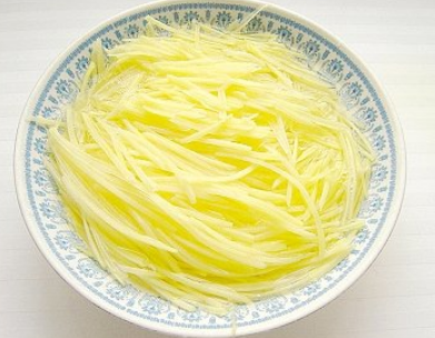 土豆丝去皮切成丝,用清水洗净表面的淀粉,再浸泡5分钟。